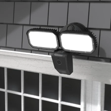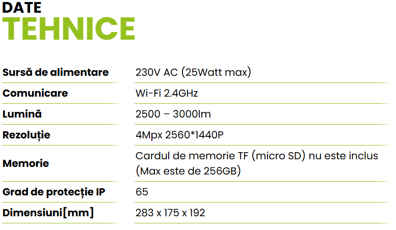 Această cameră inteligentă Wi-Fi pentru exterior combină supravegherea video de înaltă calitate cu o lampă LED puternică, oferind siguranță și vizibilitate sporită. Comunicarea se realizează prin Wi-Fi 2.4GHz, iar lampa LED poate ajunge până la 3000 lumeni. Camera poate fi montată pe perete și este concepută pentru utilizare în exterior.