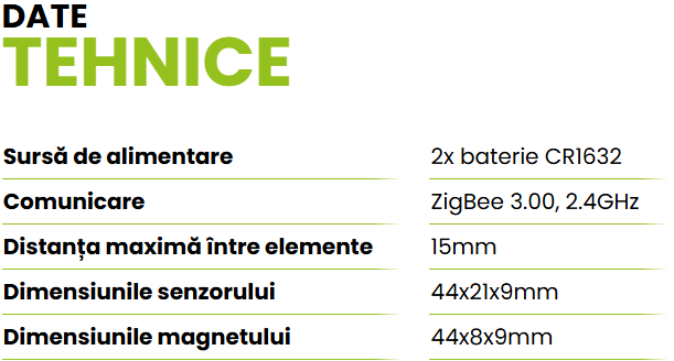 DOOR-MINI este un senzor magnetic alimentat cu baterii, compatibil cu standardul ZigBee 3.0. O modificare a stării dispozitivului trimite automat un semnal către poarta de internet ZigBee (de ex. EGATEZB). Acesta poate fi utilizat pentru a stabili reguli de funcționare a aparatelor de uz casnic (scene) și acolo, unde sunt necesare informații despre deschiderea sau închiderea ușilor, ferestrelor, ușilor de garaj etc. Cu ajutorul aplicației Engo Smart, pot fi create relații între senzorul de deschidere a ferestrei și regulatorul de temperatură din cameră (de exemplu, dacă se deschide o fereastră, încălzirea sau aerul condiționat sunt oprite). Deschiderea este detectată în funcție de distanța între senzor și magnet. Produsul este destinat exclusiv utilizării în interior.