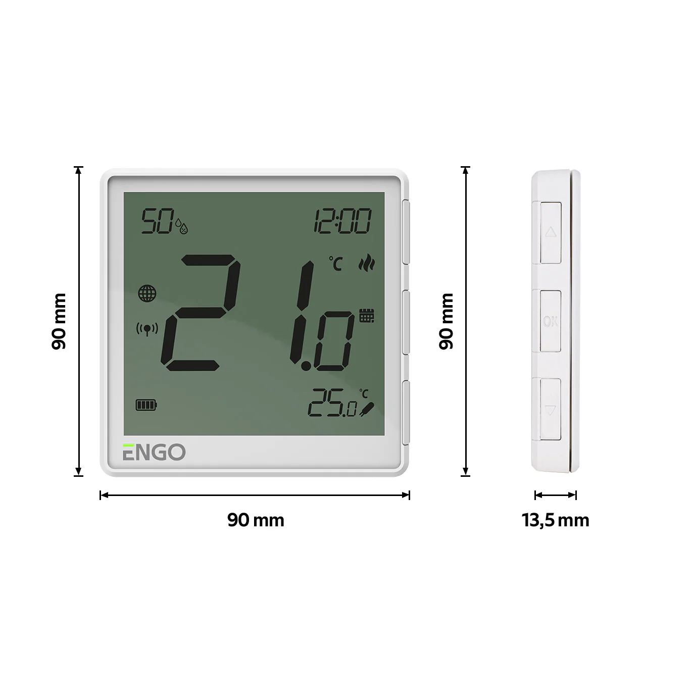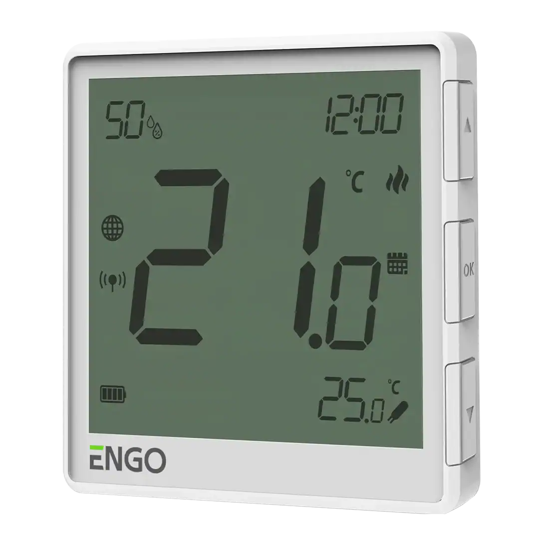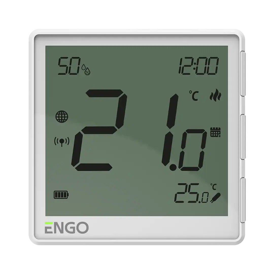 Regulator de temperatură inovator cu senzor de umiditate integrat. Este o combinație de modernitate cu precizie de funcționare și un design interesant. Acesta se caracterizează prin simplitatea instalării și a funcționării. Atât versiunea cu baterie montată pe suprafața peretului (baterie litiu-ion încorporată), cât și cea cu alimentare de la rețea (230V) pot fi controlate fără fir prin intermediul aplicației ENGO Smart, folosind poarta de internet ZigBee 3.0 EGATEZB. Versiunea încastrată poate fi conectată cu fir direct la un receptor (de exemplu, o bară de control cu fir). Acesta este conceput în principal pentru a controla sistemele de încălzire prin pardoseală.